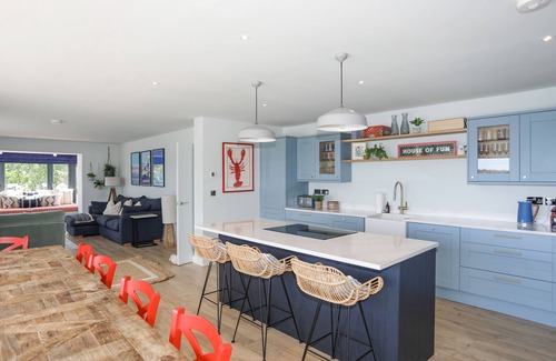 This property has an open-plan kitchen, dining area and sitting area, a utility with washing machine, tumble dryer and walk-in shower, and a first-floor sitting room. The bedrooms have Smart TVs and consist of two super-king-size (zip/link) with en-suite, a ground-floor super-king-size with en-suite, and three king-size rooms, along with a ground-floor bathroom. Outside there is a wrap-around lawn, a balcony with furniture, wood-fired hot tub, and fire pit, and private parking for five cars. This is a smoke-free property. You'll find a shop and a pub in 0.4 miles and the marina in 0.5 miles. WiFi, fuel, power, bed linen and towels are all included in the price. Ynys Faelog is a fabulous base for an Anglesey staycation. Note: Guests have access to a private walking trail and a shared beach, Note: Guests have access to the tennis court upon the island. Note: Check-in from 4pm, check-out by 10am. Note: There are steps to the exterior.