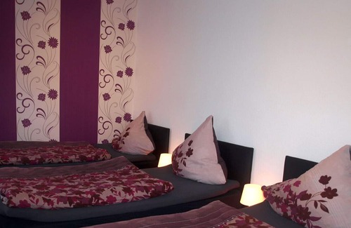 Large cozy guest apartment (95 sqm) with three rooms. 1 double room "Green Oasis" 25 square meters, 2 single box spring beds with additional sofa bed, 1 double room "Lila Energie" 20 square meters, 2 single boxspring beds and 1 lounge 30 square meters with a living area, which can be put together as a double bed 2x2m.