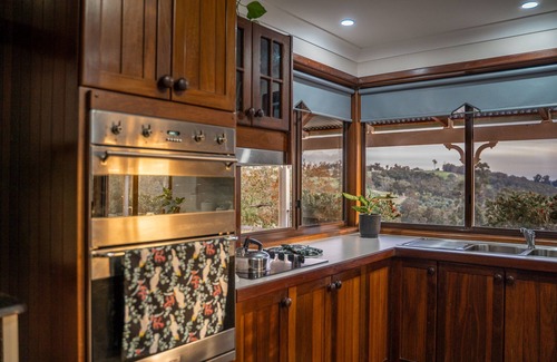 Recently renovated, our charming farmhouse has room for everyone! The lodge includes a fully equipped large kitchen with sweeping views across the valley. It features a stove top, fridge, oven and all cutlery and crockery is provided. The kitchen overlooks the family room/lounge and dining area which has a woodfire for those cooler days and nights. This room overlooks the outdoor children’s cubby house and play area. A large sitting room with an inbuilt bookcase, second wood fire and kids corner is opposite the formal dining room which seats up to 6 people. There are 4 large bedrooms all with queen beds, one room also has 2 bunk beds. The lodge has two bathrooms both with showers, one of which is wheelchair accessible and the other has a bath.