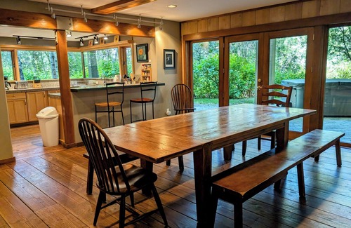 Outside is a wonderland of what the Wood River Valley offers. We are on 2+ acres of forested land located on a seasonal creek which usually runs April through October (it has sweet little trout - please get a permit before fishing). There is also a large patio off the Main House with a beautiful hot tub.
